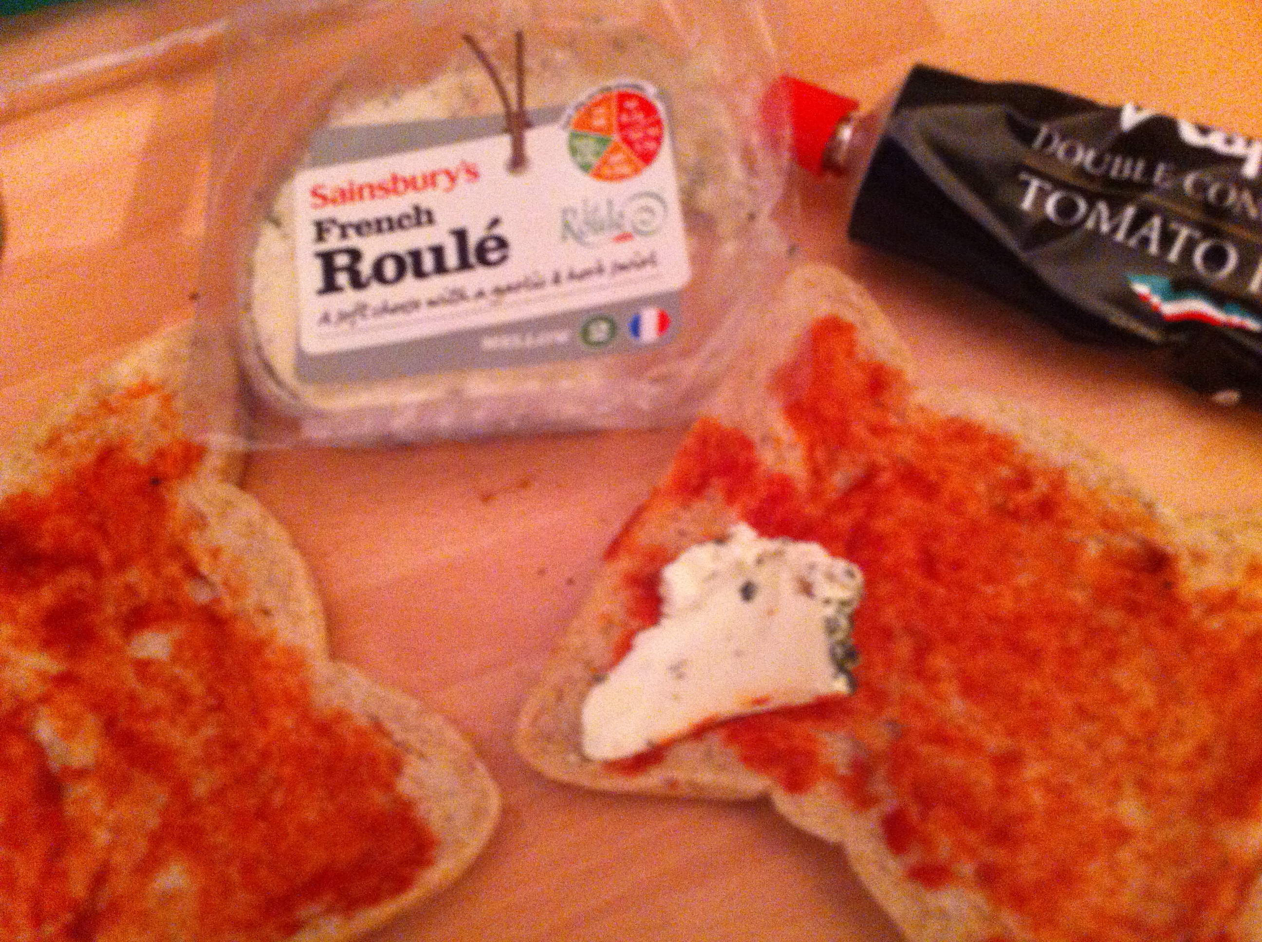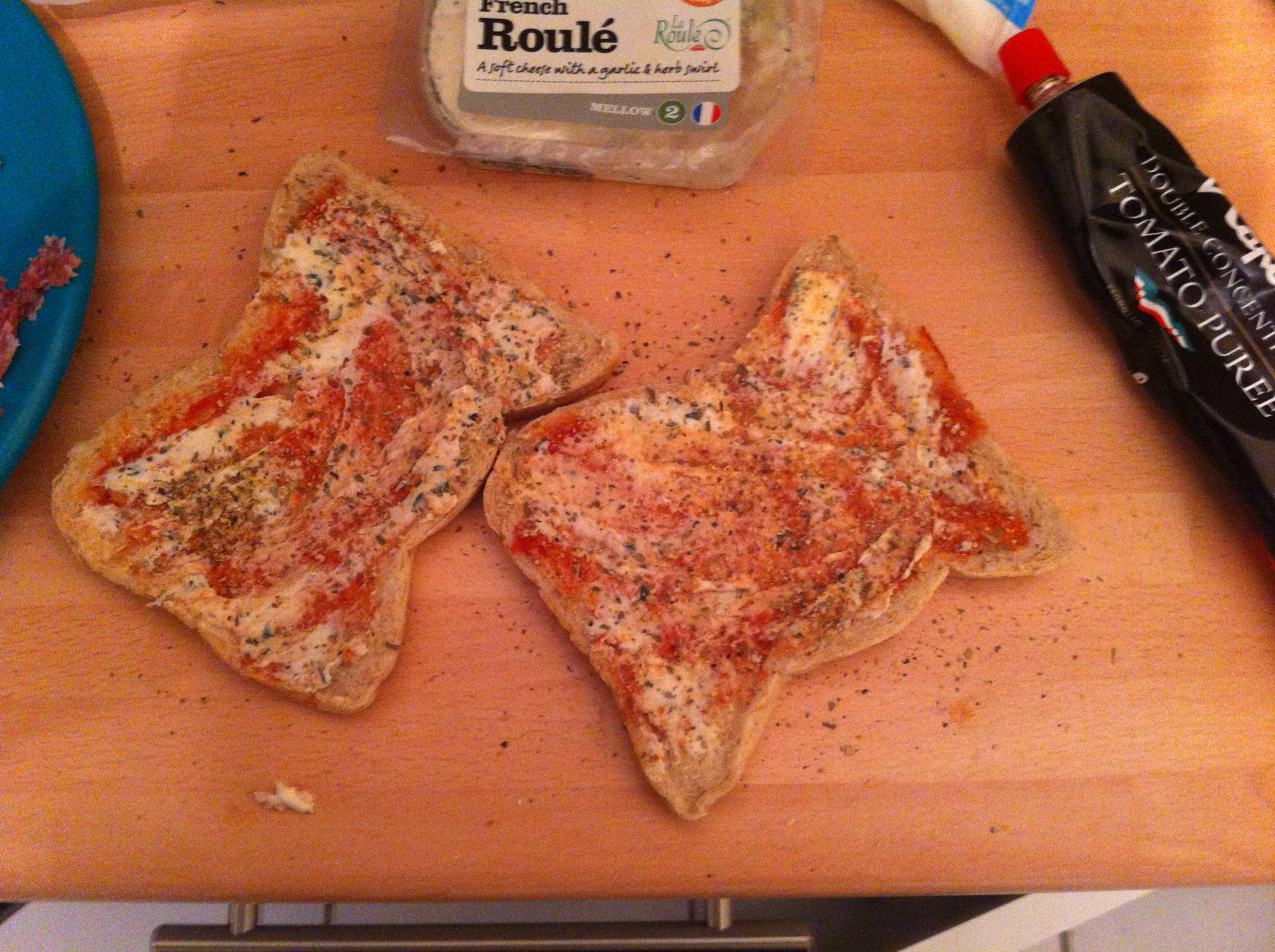 Now Seeing as I’m fancy as fuck, I had some french roulé cheese in the house too (doesnt everyone?) and I spread that with tomato puree for a more creamy sauce