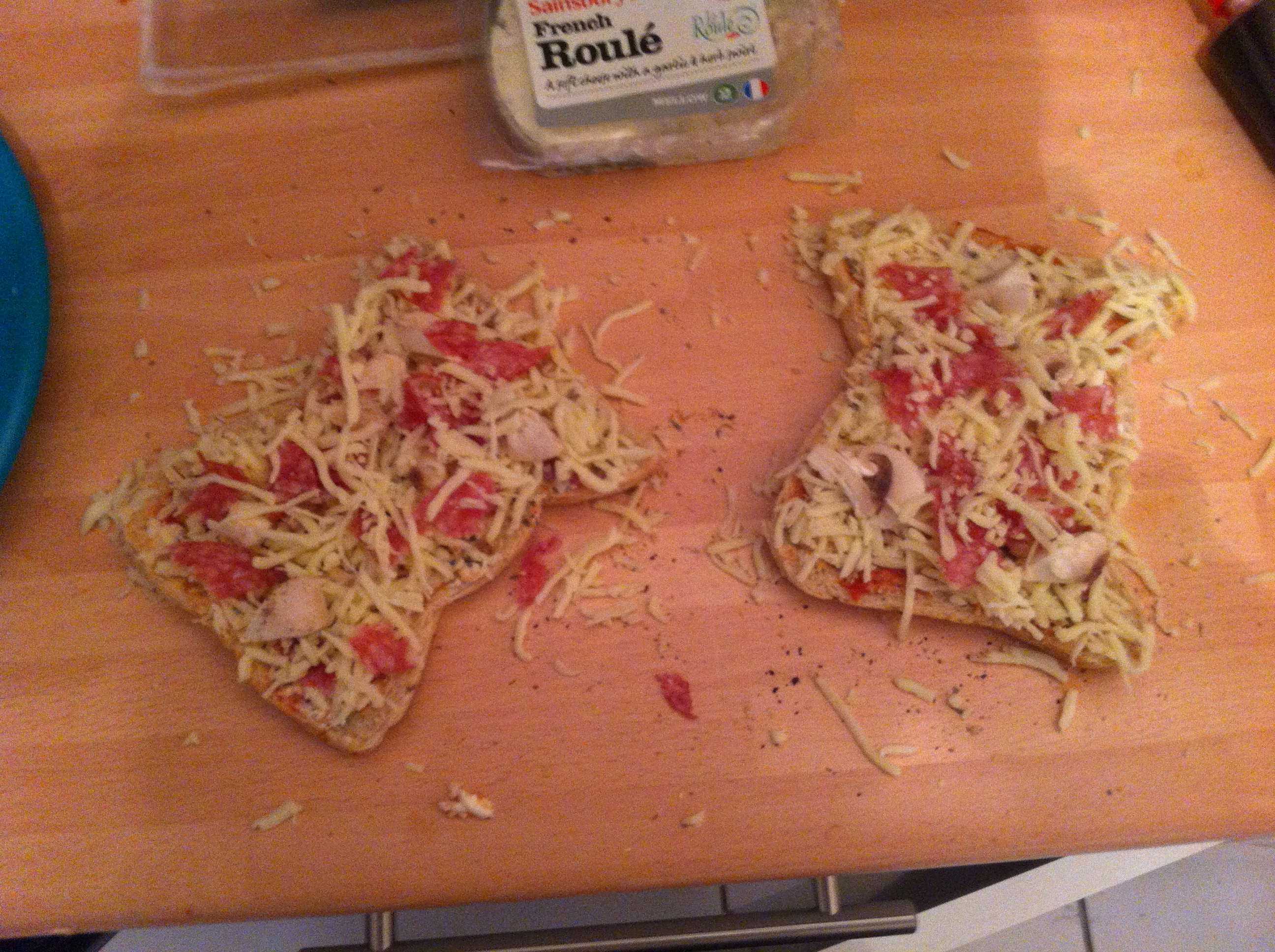Luckily I had quite a lot of pizza-ish ingredients in the house: salami, cheese, italian herbs, mushroom and tomato puree. Oh and two slices of toast obiously