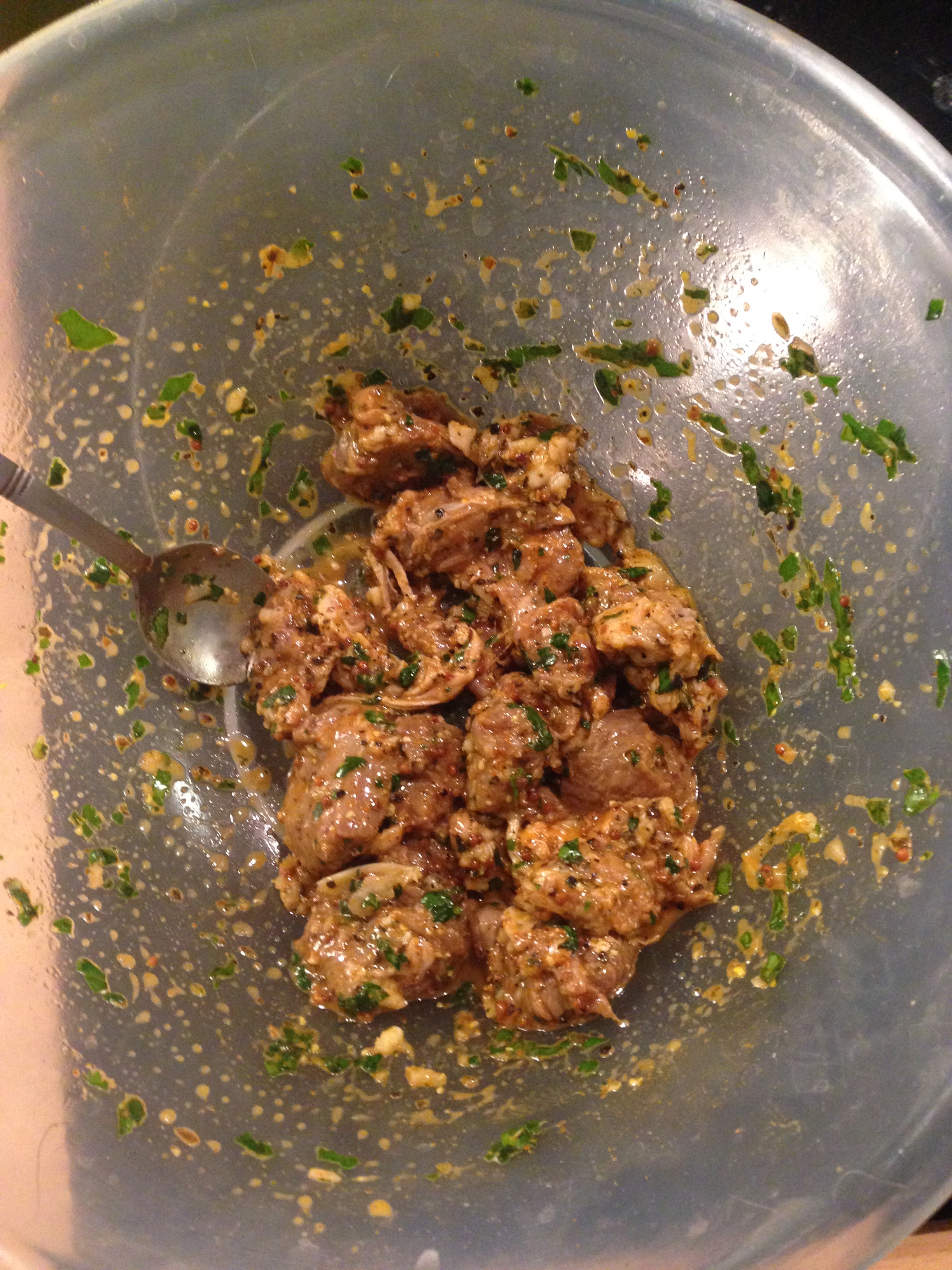 Like most of my dishes/recipes, I almost always have no idea what im going to make until theyre finished & I make em up as I go along. I started out with a bit of lamb neck chopped up, which I seasoned with crushed black pepper and i tiny bit of all purpose seasoning. Then comes the marinade : I grabbed a small ramekin and mixed the juice of half a lemon, some chopped up corriander, a crushed clove of garlic, a teaspoon of dried mint & a teaspoon of wholegrain mustard, a bit of olive oil, whisked them altogether with a fork, then mixed them in with the lamb and left it there to marinade for an hour or so. After that, heat up a dry griddle pan & cook the lamb for about 5 minutes either side.