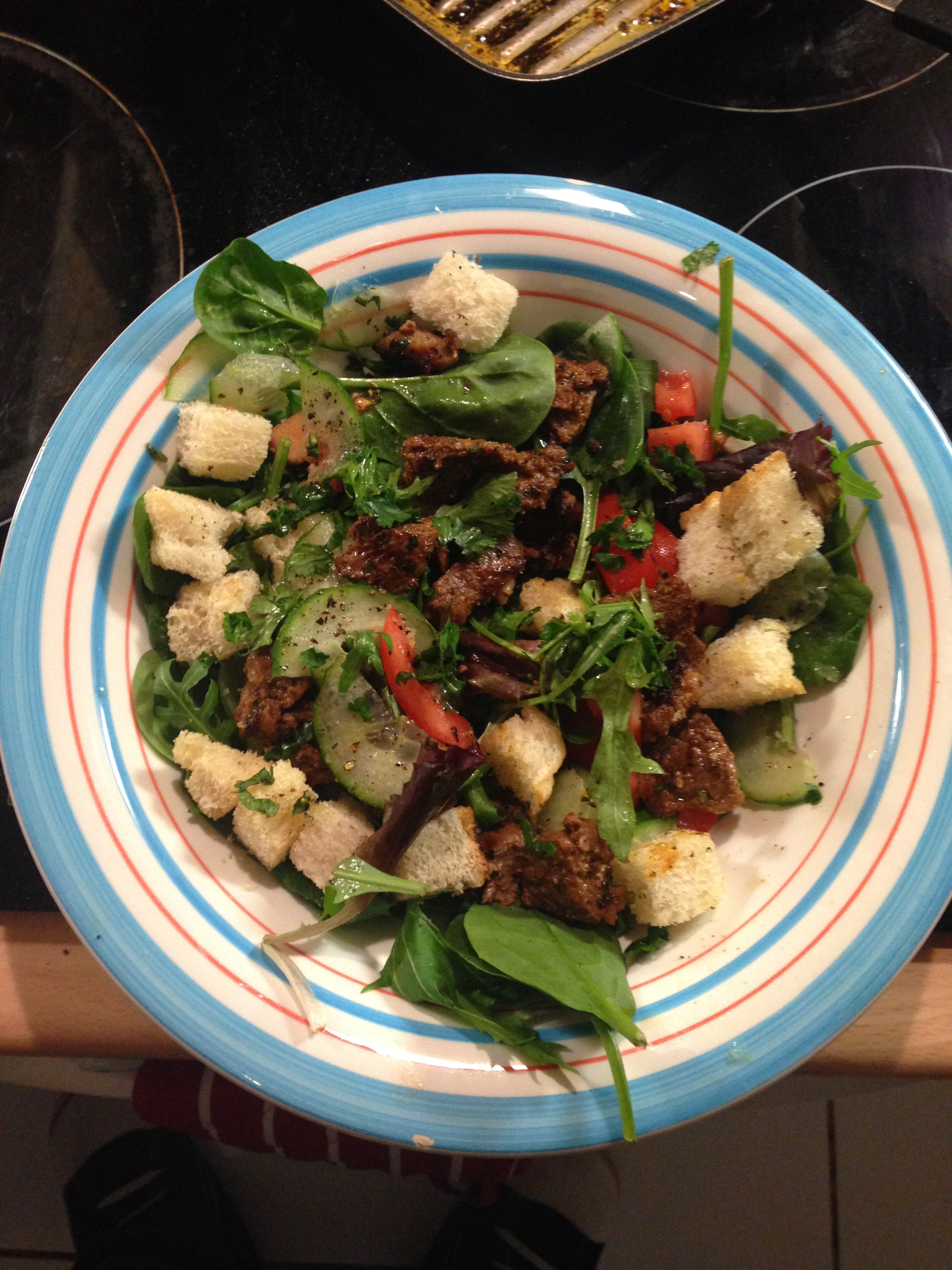 After that I got some rocket, baby spinach, tomato and cucumber, put in the croutons and then finally the lamb & boom! we are done!